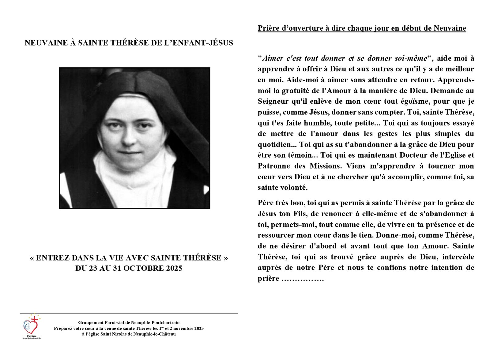 Dans le cadre du centenaire de la canonisation de sainte Thérèse de l’Enfant-Jésus, l’église Saint-Nicolas a la joie d’accueillir du 17 octobre à fin novembre 2025 une exposition itinérante internationale "Sainte Thérèse de Lisieux" mise à disposition par l’association « Les amis de Thérèse et du Carmel de Lisieux »